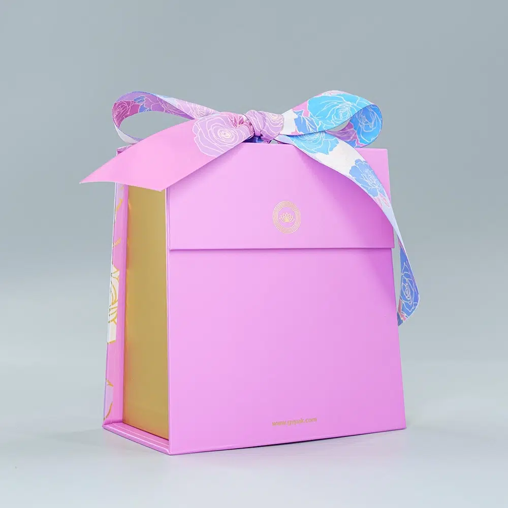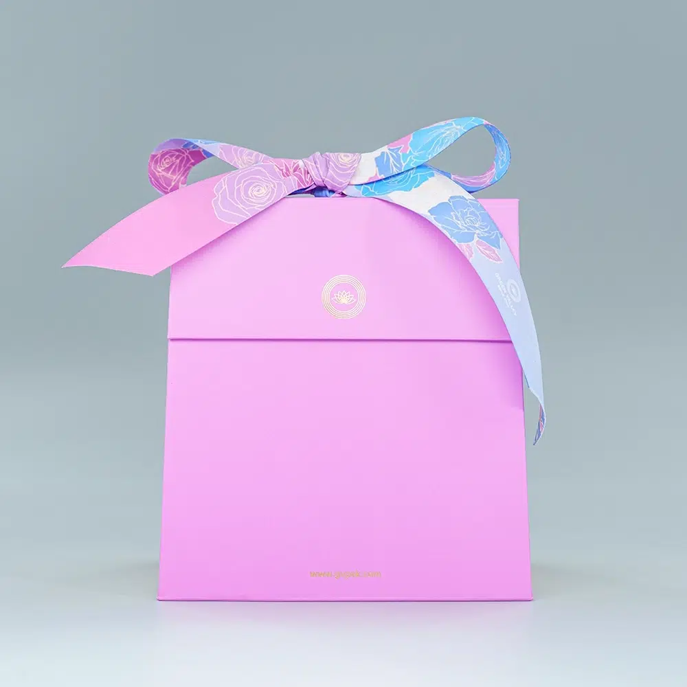 The coordinating ribbon handle features complementary rose patterns in vibrant blue and pink hues, transforming functional carrying capability into a decorative statement piece that recipients will want to display long after purchase.