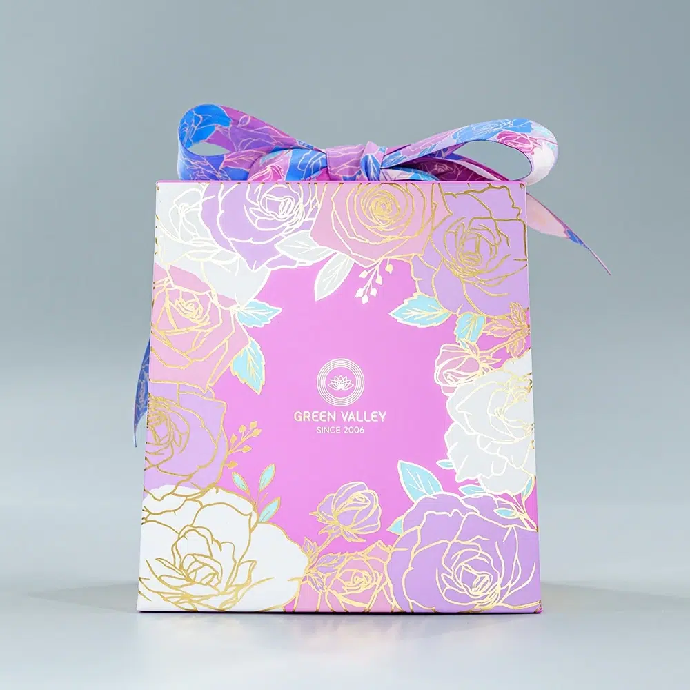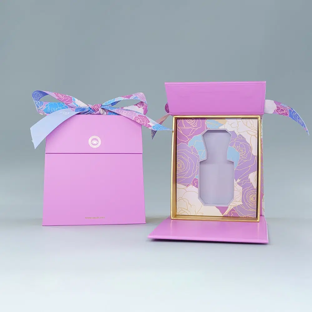 This captivating handbag-style packaging merges fashion-forward design with practical functionality, offering fragrance brands a distinctive presentation solution. The romantic purple tone provides an ideal canvas for intricate golden floral artwork that wraps around the exterior, creating an enchanting garden effect.