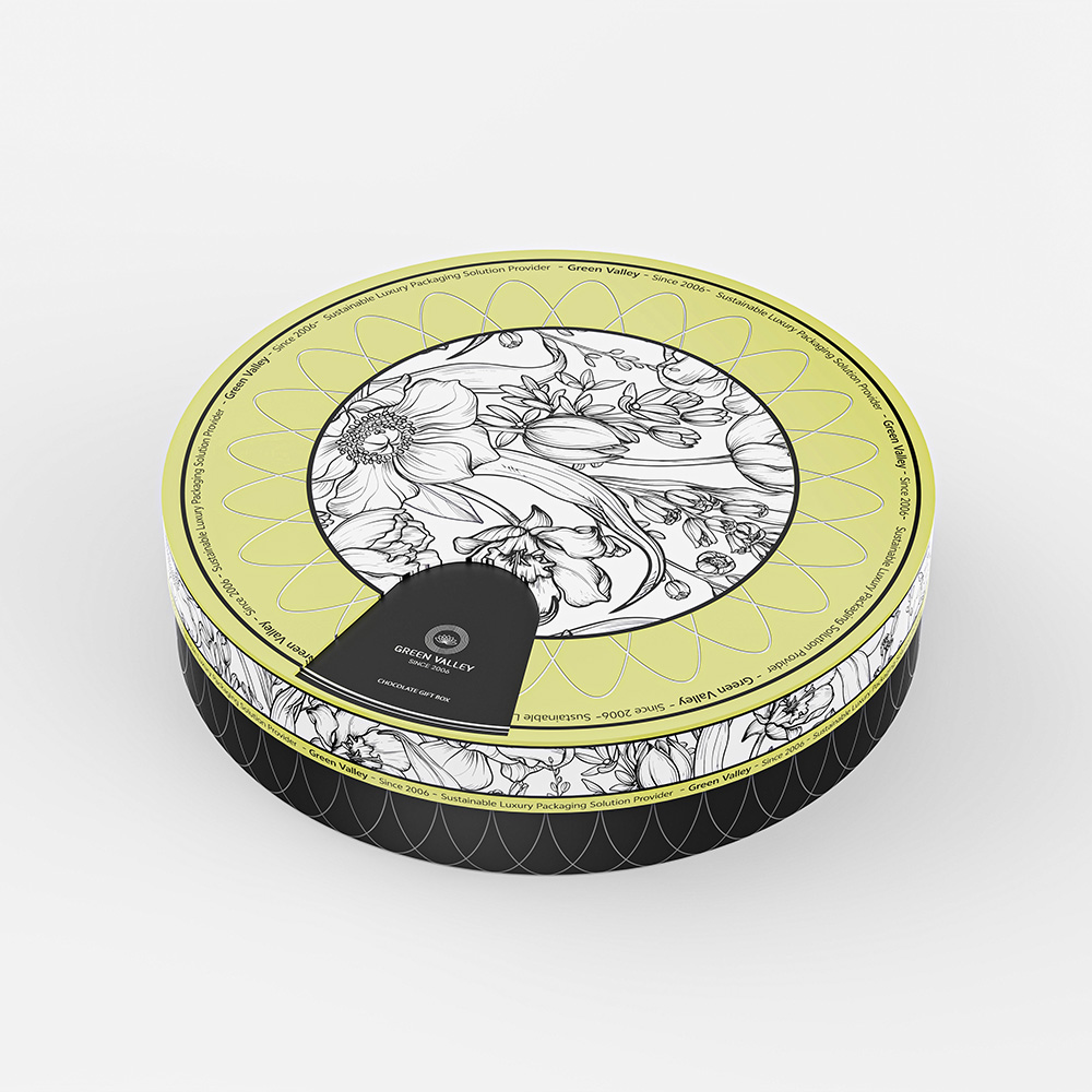 These exquisite custom wholesale fancy round chocolate boxes showcase the perfect blend of elegance and functionality for premium confectionery brands. Each round box for chocolate features a sophisticated design with delicate floral illustrations and vibrant color schemes in pink, yellow, and blue variants.
