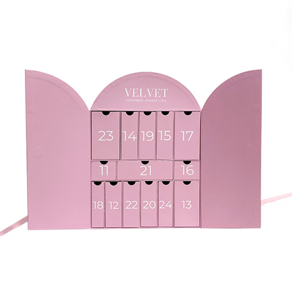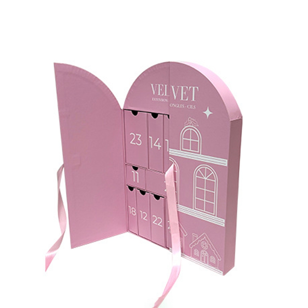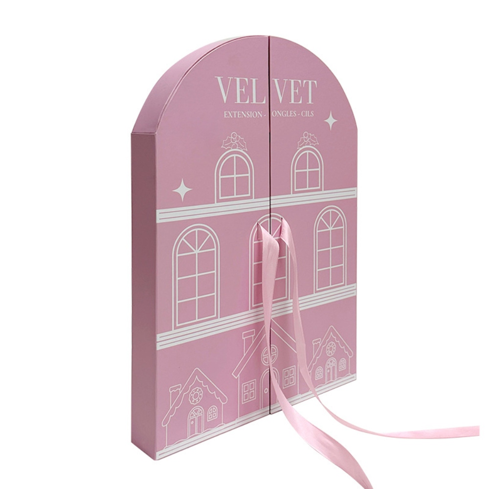Charming architectural details define this pink house shaped double-door calendar box, featuring whimsical window illustrations and decorative building elements across its curved facade. The advent calendar box incorporates 25 numbered pull-out drawers arranged in a multi-story house design, complete with arched windows, door frames, and rooftop details. Each calendar gift box drawer slides smoothly to reveal hidden compartments perfect for small gifts, candies, or beauty items, while the soft pink color scheme creates an enchanting festive atmosphere that appeals to all ages.