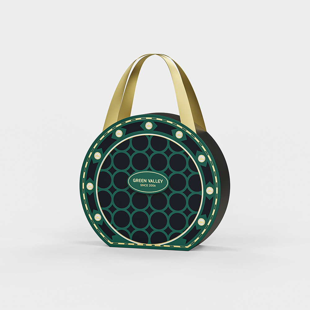 Deep forest green coloration establishes sophisticated brand presence while the integrated carrying handles provide practical portability without compromising aesthetic integrity. Golden circle patterns create visual depth against the rich emerald backdrop, with pearl-like accent dots adding tactile interest and premium appeal. This carefully curated color palette resonates across cultural boundaries, making it ideal for international markets where green symbolizes prosperity and growth.