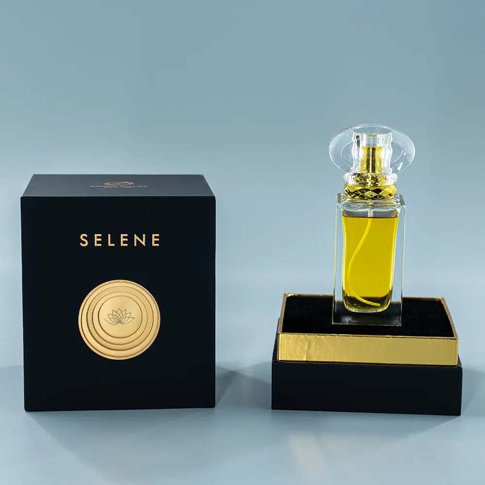 Ideal for boutique fragrance brands seeking distinctive packaging that reflects their premium positioning. The lotus emblem symbolizes purity and rebirth, adding meaningful symbolism to the visual appeal. This versatile design adapts seamlessly to various bottle shapes and sizes, offering flexibility for different product lines.