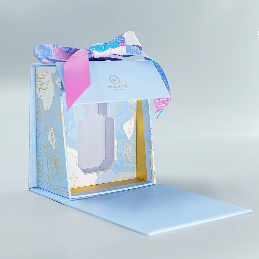 The magnetic flip closure operates smoothly, revealing thoughtfully designed interiors that cradle bottles securely within custom-shaped inserts surrounded by coordinating floral artwork. This attention to experiential details drives customer satisfaction and social media sharing. Perfect for limited edition releases, seasonal collections, or premium product launches where distinctive packaging reinforces brand positioning.