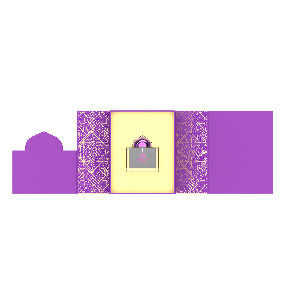 This premium wholesale magnetic purple Arabic perfume box combines sophisticated violet hues with authentic Middle Eastern design elements to create luxurious packaging that stands out in competitive markets. The rich purple exterior adorned with intricate Islamic geometric patterns speaks to discerning customers who value both aesthetic excellence and cultural authenticity. Golden accents complement the deep purple base, creating visual depth that elevates the unboxing experience for fragrance enthusiasts.