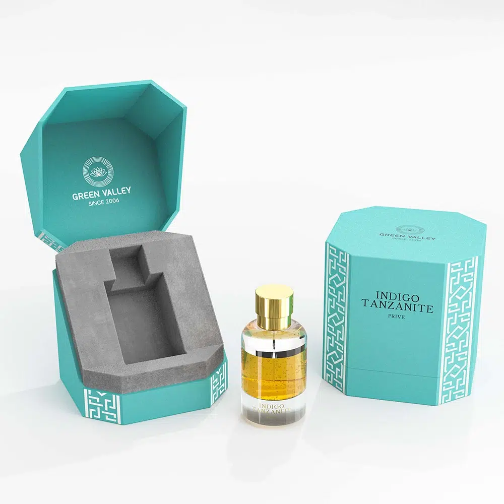 The innovative flip perfume box mechanism reveals a perfectly crafted interior with custom-molded gray foam inserts that securely cradle the perfume bottle. This thoughtful design ensures maximum protection during transport while maintaining the product's pristine condition. The octagonal shape adds geometric sophistication, setting this packaging apart from conventional rectangular designs.