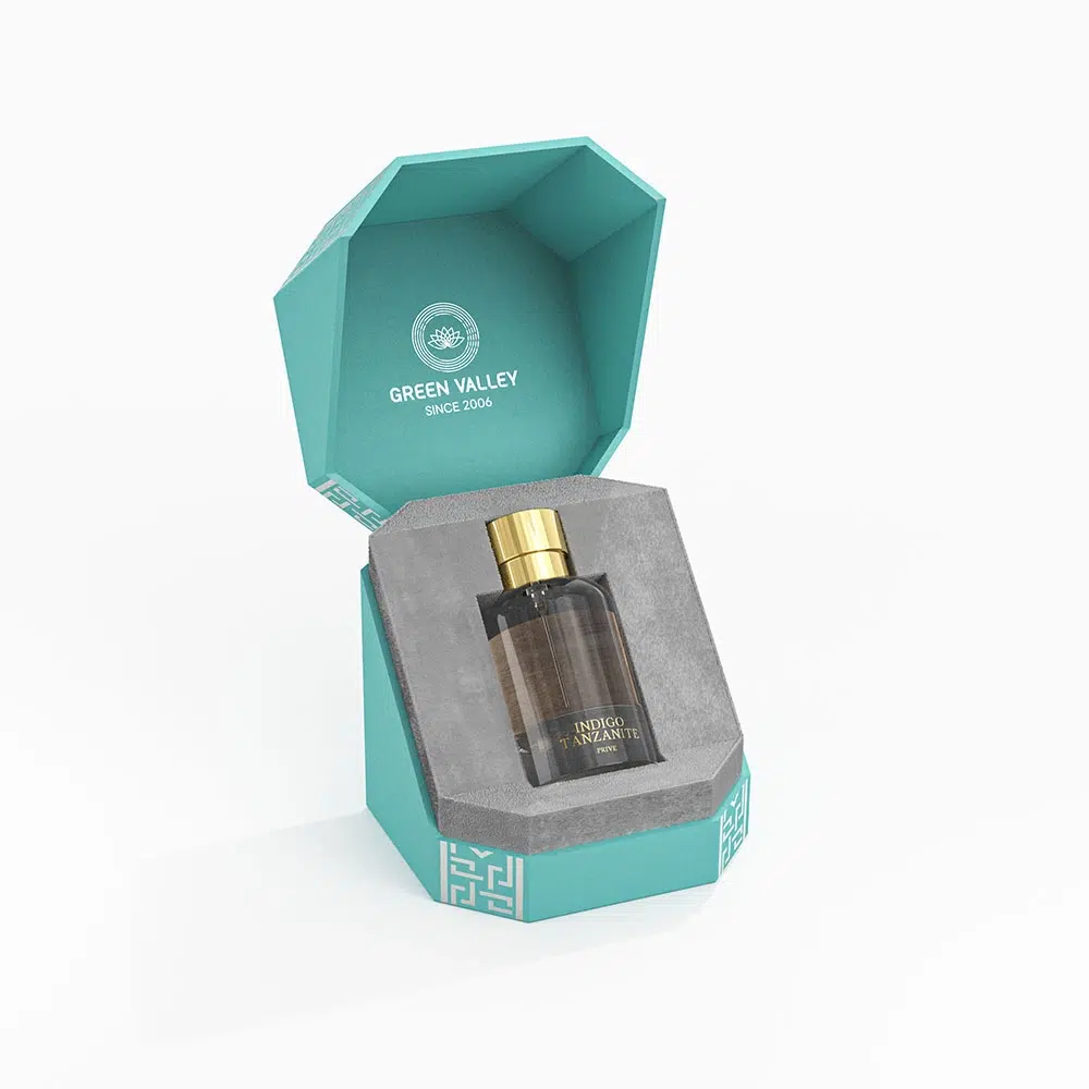 This Custom Blue-green Flip Perfume Box showcases exceptional craftsmanship in luxury fragrance presentation, featuring a stunning aqua-teal color palette that instantly captivates the eye. The sophisticated blue-green perfume box design combines modern elegance with practical functionality, creating an unforgettable unboxing experience for discerning customers.