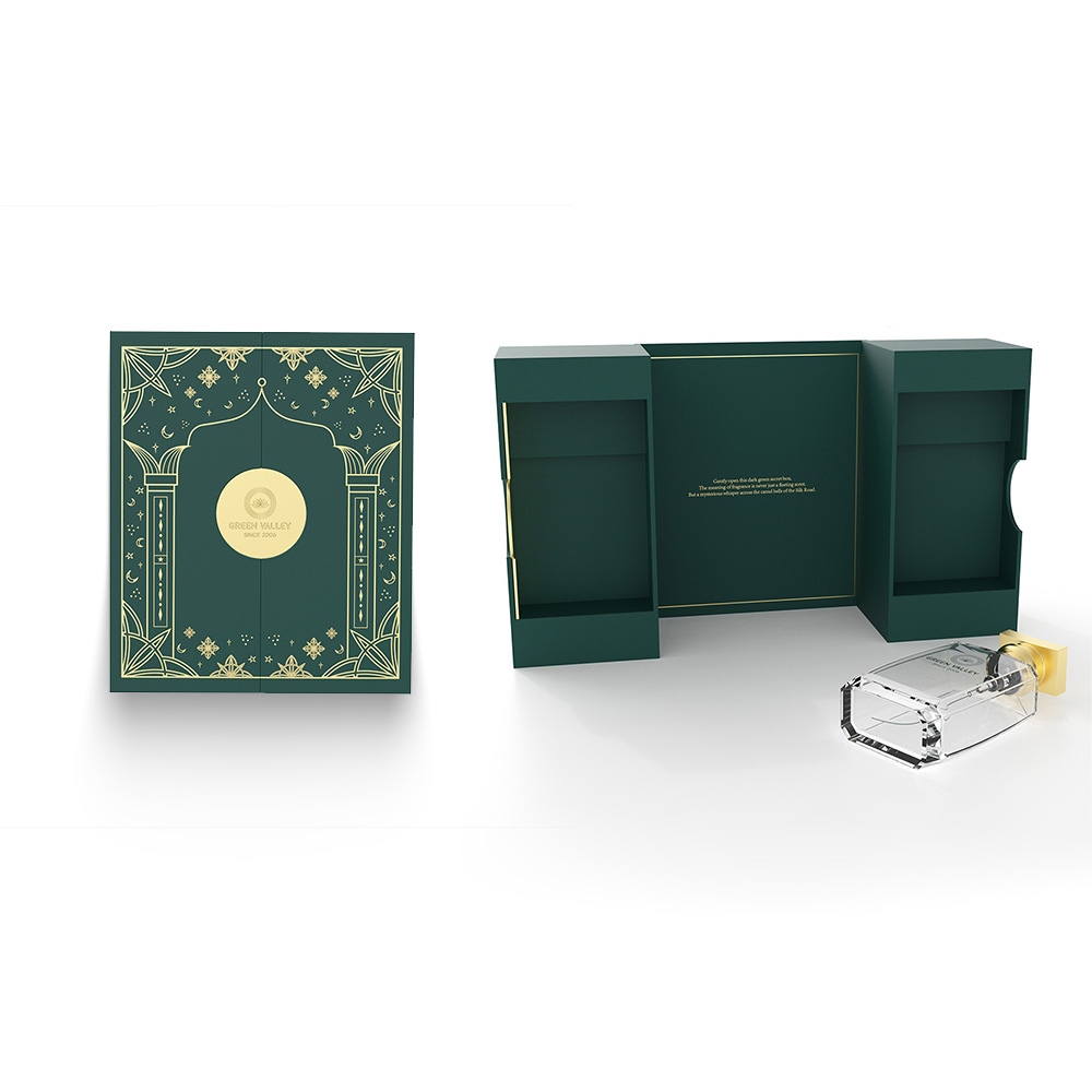 This wholesale luxury Arabic style double door open green perfume box showcases exceptional craftsmanship through intricate geometric patterns and ornate golden detailing that pays homage to traditional Middle Eastern artistry. The sophisticated forest green colorway creates an immediate sense of opulence and exclusivity, while the elaborate border designs featuring celestial motifs and architectural elements establish cultural authenticity. Each Arabic perfume box demonstrates meticulous attention to detail, with precisely executed foil stamping and embossed elements that create tactile richness and visual depth unmatched by conventional packaging solutions.