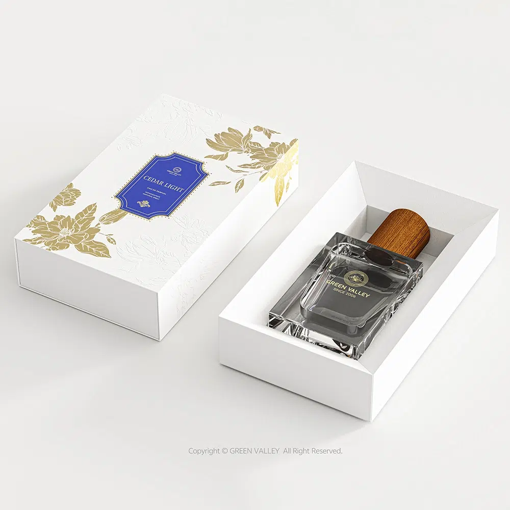 This perfume drawer box packaging combines classical aesthetics with contemporary functionality through its sliding mechanism and ornate surface treatment. The white base features intricate gold floral design perfume packaging elements, including embossed peony motifs and delicate botanical illustrations that create a multidimensional visual effect.
