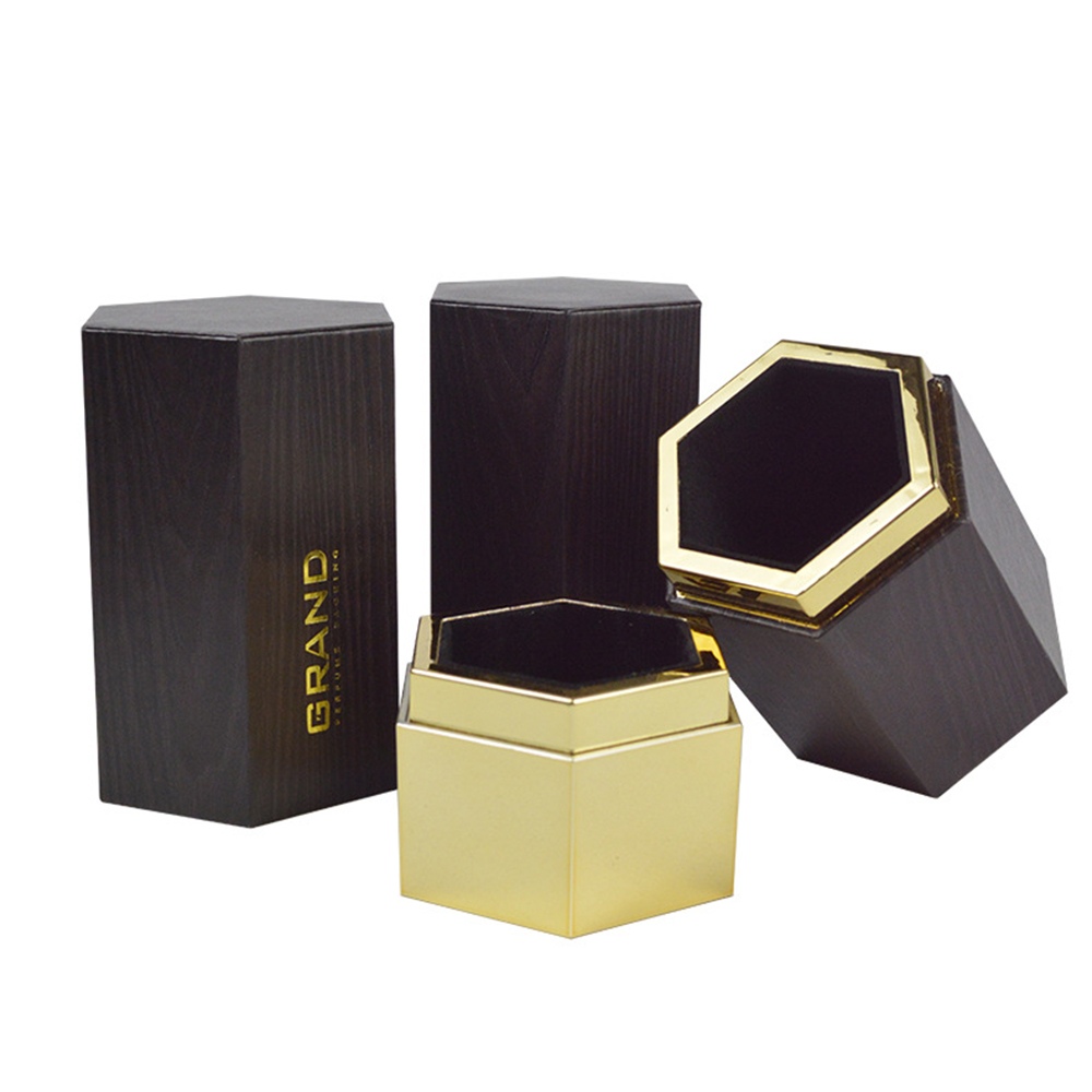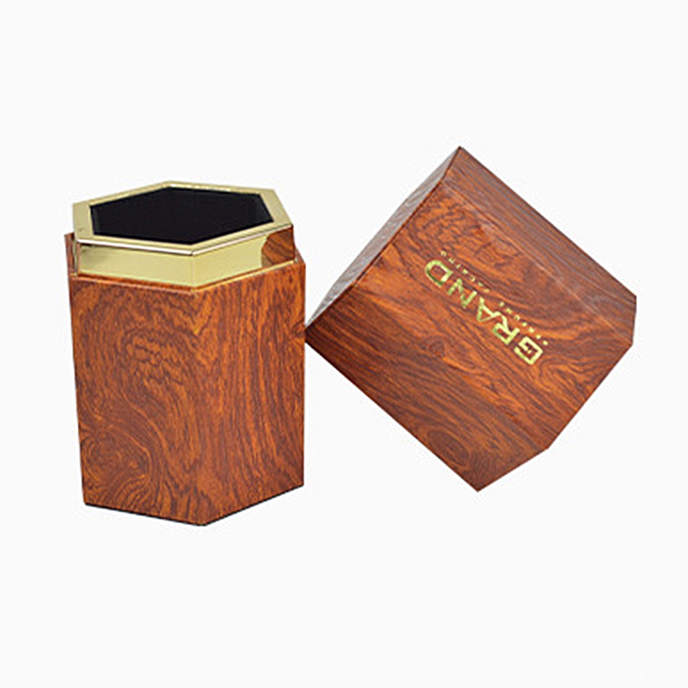 This geometric lipstick high-end MDF box showcases a distinctive hexagonal design with rich wood grain finishes available in both natural walnut and dark ebony tones. The perfume MDF box features precision-cut angles and golden brass trim accents that create a sophisticated geometric silhouette. Each MDF perfume box includes a plush velvet-lined interior with custom foam inserts, while the unique hexagonal shape provides stable display properties and efficient storage solutions for luxury cosmetics and fragrances.